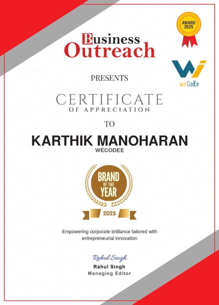 We are proud to share that our CEO, Mr. Karthik Manoharan, has been featured in the Brand of the Year 2025 edition of Business Outreach Magazine. This prestigious recognition reflects his visionary leadership, strategic foresight, and relentless commitment to innovation and excellence. Under his guidance, Wecodee has grown not just as an organization, but as a workplace that values collaboration, integrity, and continuous learning. From an HR perspective, it is truly inspiring to witness how his leadership empowers teams, nurtures talent, and creates an environment where people are encouraged to challenge limits and grow together. His clarity of vision continues to shape a strong culture that aligns people, purpose, and progress. We extend our sincere appreciation to the Business Outreach Magazine team for recognizing his contributions and for spotlighting Wecodee on a respected national platform. On behalf of the HR function, we extend our heartfelt congratulations to Mr. Karthik Manoharan. We are proud to stand behind his vision and remain committed to supporting Wecodee’s journey toward sustained growth and future success. 👏 Congratulations once again on this well-deserved recognition!